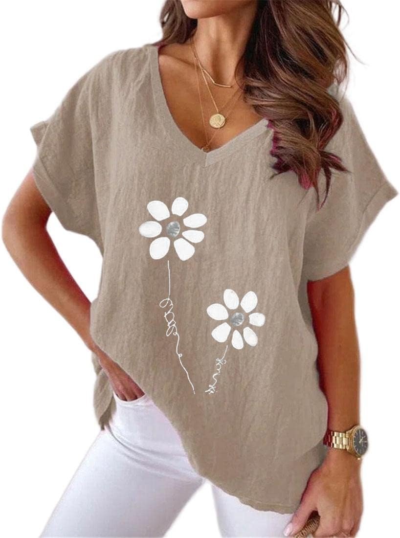 Womens Summer Cotton Linen Sunflower Floral Tops Loose Fit Summer Casual V Neck Short Sleeve Tshirts Tees